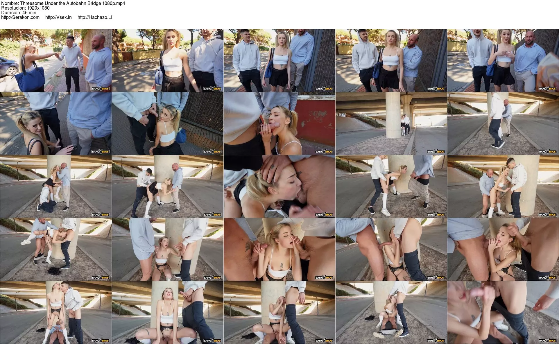 Angelique Lapiedra was walking down the street when she met Leo, Tommy Cabrio and Emilio Ardana. Of course she liked sex and yes for a couple of 100 Euros she would suck those 2 big dicks. She did it right there in the street with cars and people going by. They moved locations to under a highway bridge. Here Angelique got naked and two dicks started to fuck her. In most positions she would suck one dick and get fucked by the other until they tried both dicks in her vagina at the same time. They fucked in all possible threesome positions until both guys took turns to come into her mouth.
