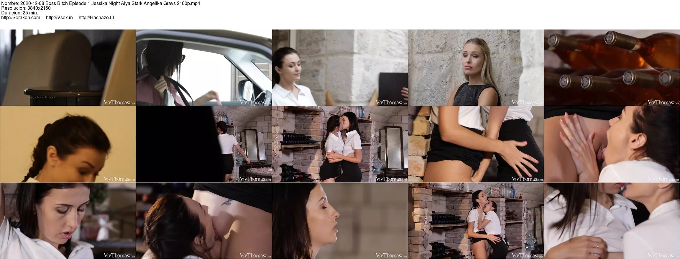 Gorgeous brunette waitress Alya Stark is hard at work preparing for a house party while her sexy blonde "Boss Bitch" Angelika Greys watches disdainfully. As episode one of Sandra Shine’s hot lesbian series begins, Alya’s cute colleague Jessika Night shows up late, and the two girls flirt discreetly under the boss’s watchful eye. When they’re alone in the wine cellar, Alya grabs Jessika for a kiss, pushing her up against the wall and sliding a hand up her short skirt to confirm that she’s not wearing panties. She sucks Jessika’s beautiful breasts as she strokes her shaved pussy, kneels to lick her ravenously, then fingerbangs her to a long, breathless orgasm. Jessika pushes Alya back onto the table, sucking her stiff nipples and peeling off her lacy panties, then burying her tongue in her smooth pussy. Alya moans with pleasure as Jessika eats her, unaware that Angelika can hear them from upstairs. After Alya has an intense climax, the girls rush back to work, believing their boss is none the wiser…