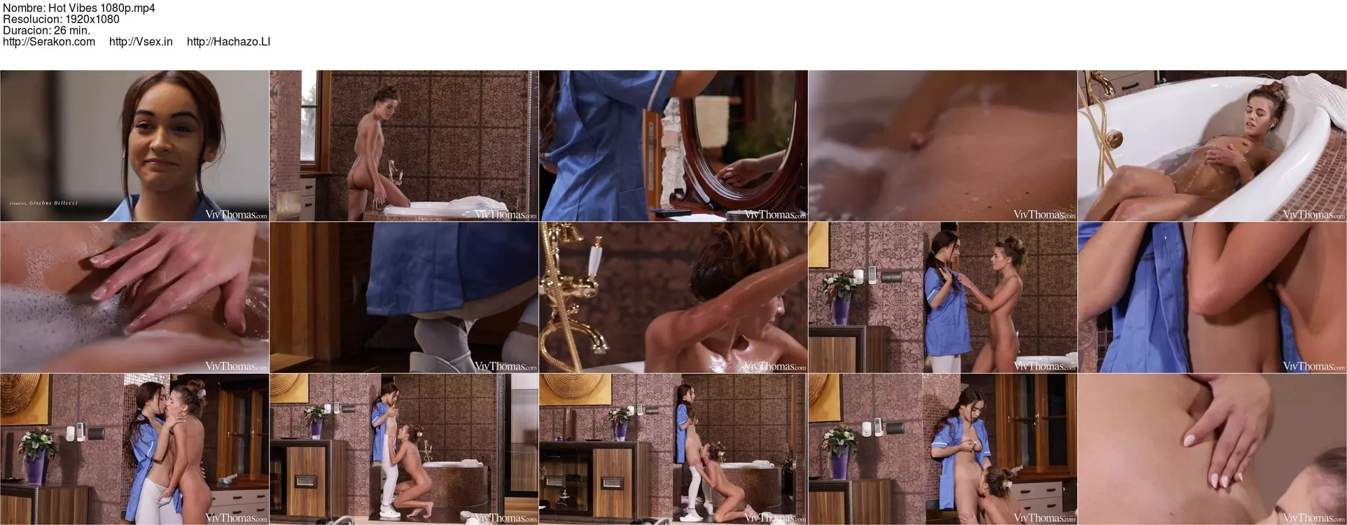 Gorgeous Ginebra Bellucci arrives at her cleaning job and puts in her earphones, as Sandra Shine’s erotic movie "Hot Vibes" begins. Meanwhile, sexy Eveline Dellai is also listening to music as she relaxes in the bathtub, each of them oblivious to the other’s presence. Eveline’s nipples are hard as diamonds as she slides a hand between her slippery thighs to stroke her pussy. When Ginebra catches her mid-orgasm, both are equally shocked; the giggling housemaid tries to apologize, but dominant Eveline insists on undressing her. When she sees Ginebra’s beautiful breasts she becomes more aroused than annoyed, sucking her dark nipples and rubbing her pussy through her yoga pants. She pulls them down as she kneels to lick Ginebra’s shaved pussy, lapping at her puffy clit to make her gasp with pleasure. Ginebra turns around, frigging herself as Eveline eats her pussy and ass from behind, driving her to an orgasm so intense she sinks to the floor, legs shaking. They move to the bed, where Ginebra goes face down ass up to lick Eveline’s hot pussy, sucking on her clit until she has a powerful climax.