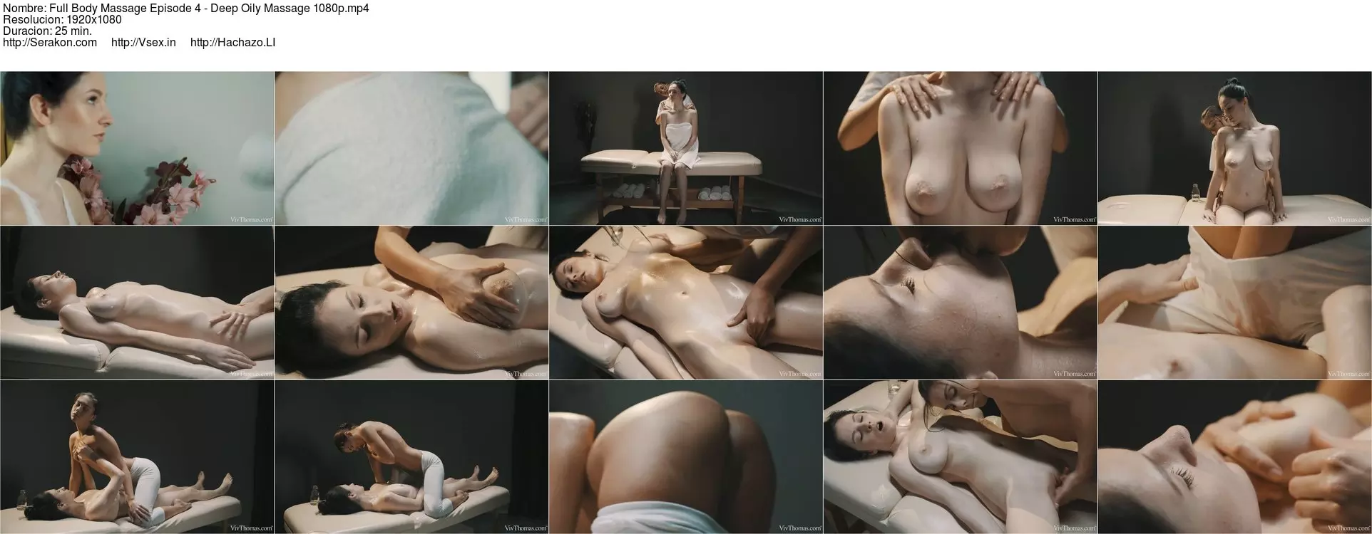 Busty beauty Angel Princess strips naked ready for a session with stunning masseuse Sabrisse, as episode four of Nik Fox’s erotic movie series "Full Body Massage" begins. Perched on the massage table, Angel looks a little shy, but as soon as sexy Sabrisse starts working her expert hands over her slender shoulders, all her tension dissipates. Sabrisse removes the skimpy towel to expose her client’s luscious large breasts, and massages soothing oil into the fleshy orbs. As she kneads and squeezes them it’s evident that both masseuse and client are enjoying the experience, and getting extremely aroused. Sabrisse pours oil over Angel’s perfect body, then rubs it all the way down to her shaved pussy. Angel parts her legs, allowing Sabrisse’s slick fingers to work their way into her fleshy folds; she gasps with pleasure as Sabrisse glides two slippery digits right inside her pussy, thrusting them deep. Sabrisse straddles Angel on the table, pouring oil over her own pussy inside her tight yoga pants, so they turn transparent as she fingers herself hard and fast. She takes off her top so Angel can caress her breasts, and tugs down her pants to let her horny client rub her hot pussy. Rubbing their slick bodies together, Sabrisse resumes finger-banging Angel, lavishing attention on her magnificent breasts, and drilling her from behind in spoons. When Angel is fully sated, she licks Sabrisse’s pretty toes as she frigs her to an equally satisfying orgasm, both of them glistening and glowing with pleasure.