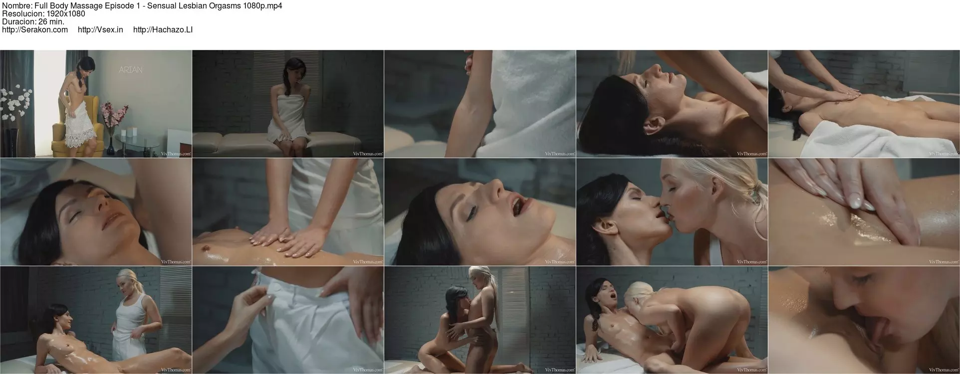 Sexy Arian is the willing recipient of cute Lovita Fate’s sensual touch, as episode one of Nik Fox’s erotic movie series "Full Body Massage" begins. Wrapped in a towel, Arian’s eyes close as she succumbs to the sensations coursing through her body, as Lovita’s hands massage her naked shoulders. When Arian stretches out on the massage table, Lovita peels off the towel to reveal that her nipples are starting to stiffen. They get really hard when Lovita massages her breasts, before moving down her body to her shaved pussy. Content to simply lie still and let wave after wave of pleasure envelop her, Arian doesn’t even move when Lovita pours massage oil over her, but she can’t keep still any longer when the adorable blonde starts massaging it into the fleshy folds of her pussy. Arian raises her slick, shiny body upwards off the table, gasping with arousal as Lovita works a finger in and out of her honey hole. When Lovita brings her tongue into play on Arian’s slippery slit and clit, the dark-haired darling starts to lose it; but it’s not until Lovita rapidly rubs the palm of her hand against her pussy that Arian goes really wild, her body spasming uncontrollably as she has a powerful orgasm. Now Lovita kneels on the massage table with her hot ass in the air. It’s an invitation for Arian to take control, and she does so with gusto, running her tongue up from Lovita’s juicy pussy and rimming her puckered asshole. Lovita rocks her body steadily, pushing herself backward onto the two fingers that Arian feverishly thrusts into her pussy from behind. Lovita turns onto her back for Arian to frig her to an intense, noisy climax. It awakens her hunger for her lover again, and she strokes Arian’s pussy avidly, making her cum again. It’s the best kind of massage, one with a happy ending for all.