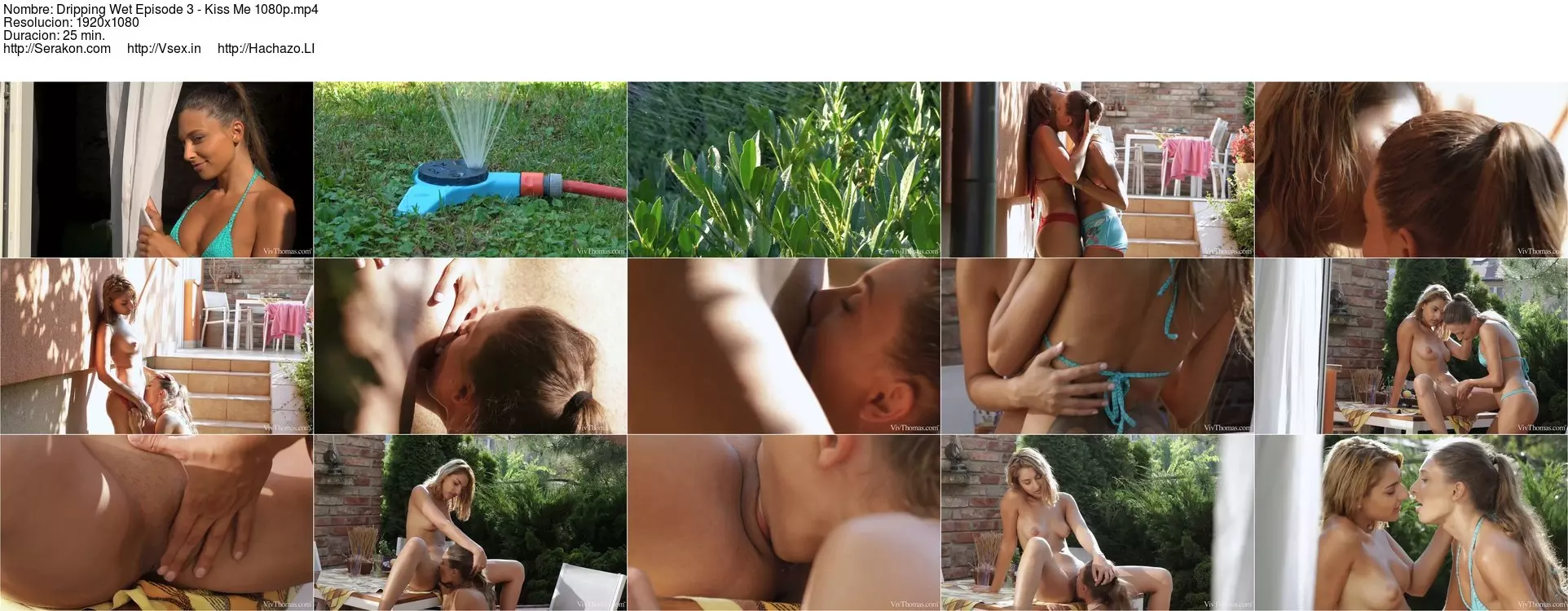 Irresistible in her sexy bikini top and shorts, Talia Mint turns the lawn sprinkler on sunbathing Sarah Cute, as episode three of Sandra Shine’s erotic movie series "Dripping Wet" begins. Soaked and surprised, Sarah retaliates by turning the hose on Talia, but soon pulls her close for a spontaneous and very passionate kiss. Talia pushes her adorable girlfriend up against the wall, tugging her bikini top aside and sucking on her stiff brown nipples. She kneels and pulls Sarah’s bikini panties down, kissing all around her shaved pussy before zeroing in on her big puffy clit, licking and sucking avidly. Sarah perches on the table and Talia – her ass looking particularly fine in her thong bikini panties – lavishes attention on her sweetheart’s perky breasts as she finger-bangs her vigorously. She kneels to eat her pussy voraciously again, then frigs her to a frantic orgasm. Sarah fondles Talia’s gorgeous small breasts and slides a hand into her bikini bottoms. Eager for more, Talia gets naked and spreads her thighs so her lover can stroke and lick her shaved pussy hungrily. Her back arches in ecstasy as Sarah’s skilful tongue drives her wild.