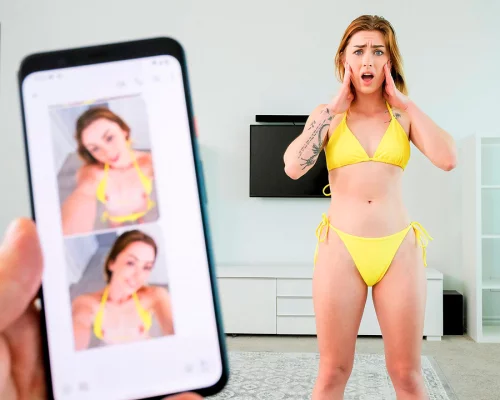 Jason refuses to let Ruby use his phone when she asks. When he finds the dirty photos, his reaction is to whip out his dick and start masturbating to them. Ruby walks in on Jason and sees what he's doing. He has a nice cock, so Ruby decides to get in on that. Getting on her knees, she strokes and sucks Jason's hardon. That's not enough for this cum loving little coed, so she gets to her feet long enough to hop onto Jason's dick in reverse cowgirl.